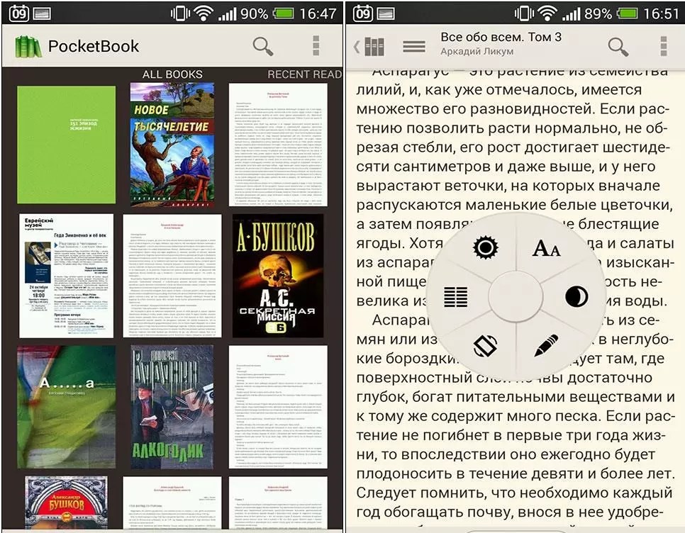В приложении есть удобный доступ к папкам. У каждой книги есть обложка. Можно искать фрагменты в тексте, настраивать яркость под определённое время суток, менять размер шрифта и делать закладки.