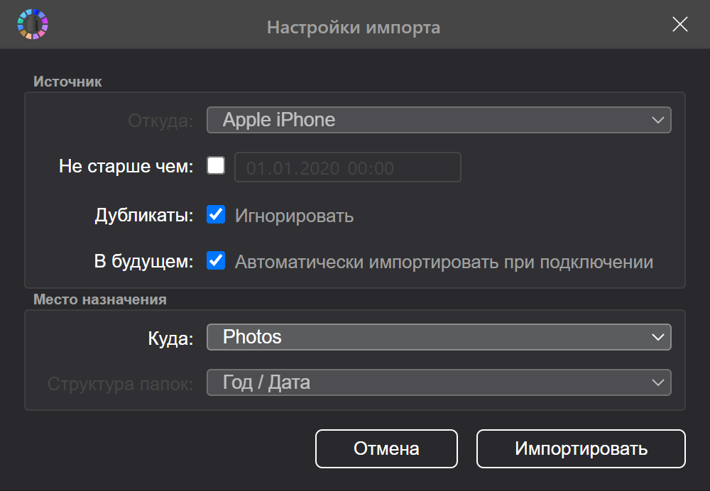 Диалог настроек импорта с iPhone в приложении Tonfotos