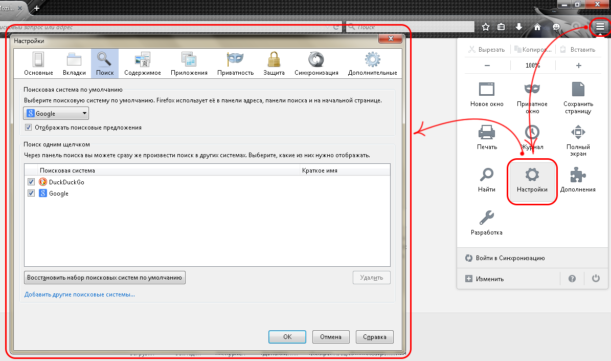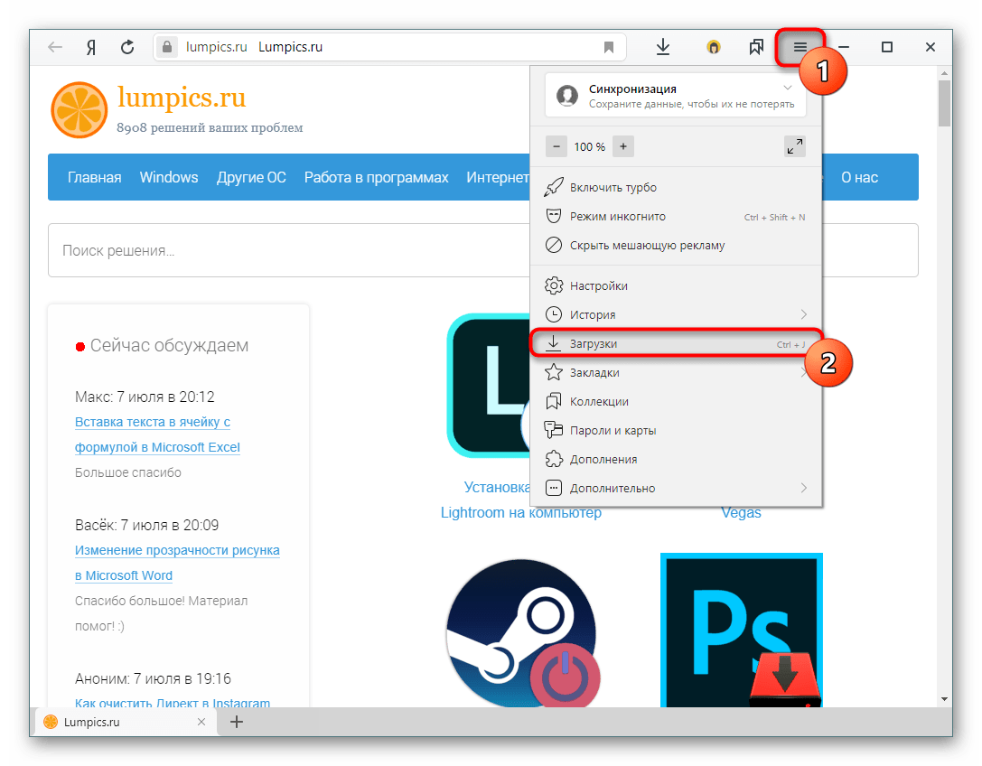 1) Для этого понадобится в правом верхнем углу открыть «Настройки» браузера (цифры 1 и 2 на рис. 2):