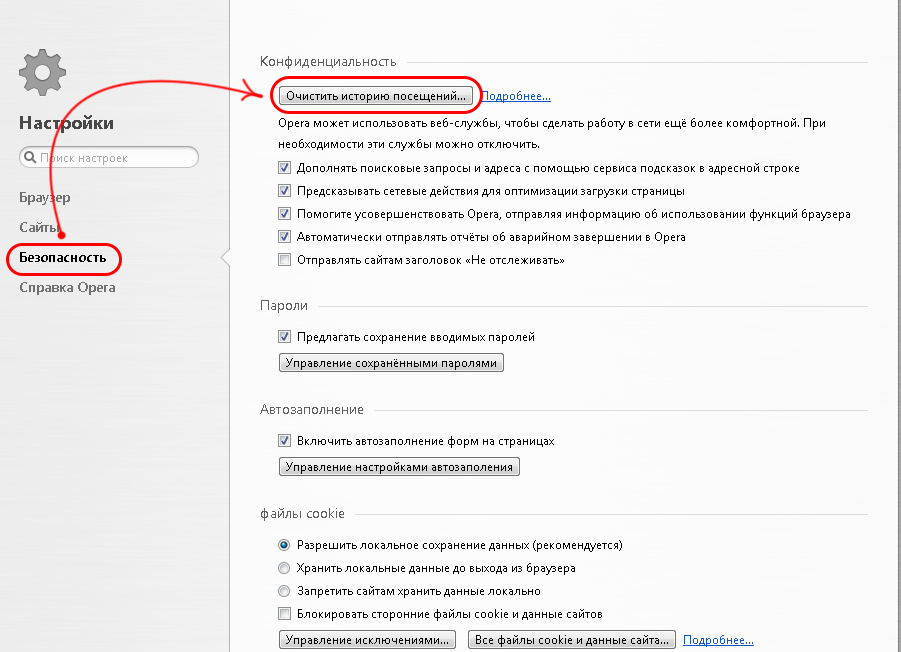 В открывшейся вкладке необходимые действия производятся в разделе «Безопасность». Именно в нем располагается кнопка «Очистить историю посещений».