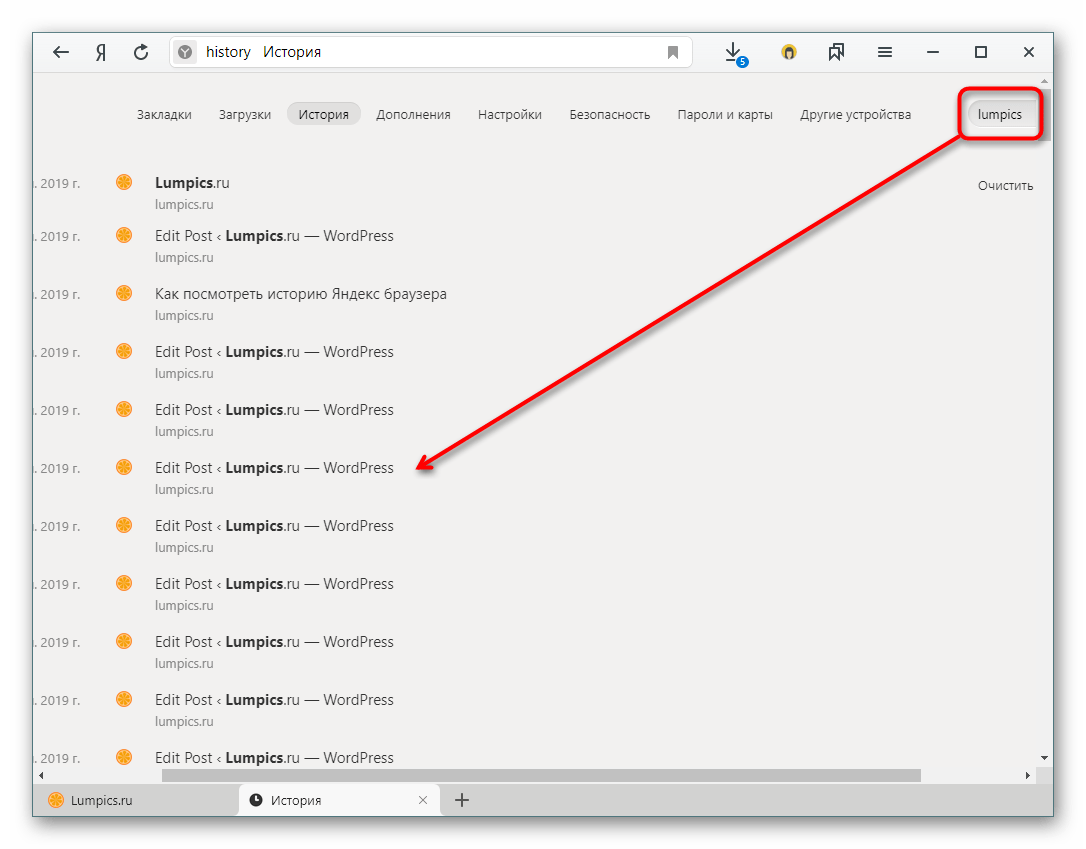 Мы находимся на странице, похожей на историю сайтов. Принцип работы здесь точно такой же.