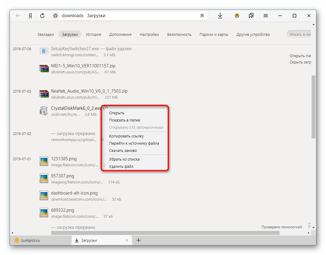 Здесь вы можете работать с каждой загрузкой – наведите указатель мыши на имя и вызовите контекстное меню, нажав на треугольник. Появляется несколько полезных дополнительных функций, каждая из которых пригодится в разных ситуациях.