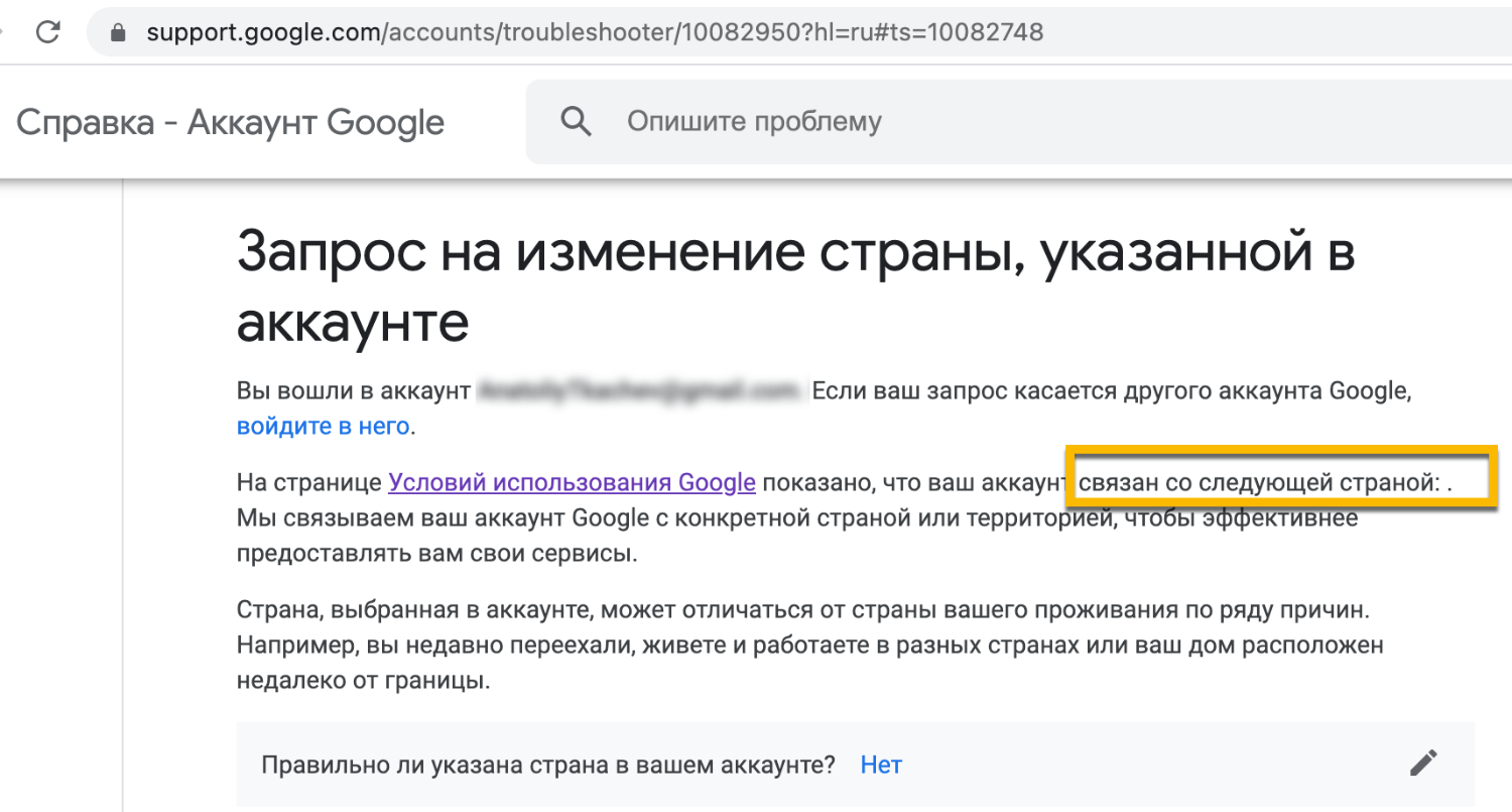 Данная страница может показывать страну, связанную с учетной записью Google, и позволяет вам запросить ее изменение, если указана неверная информация. Для этого доступна форма, которая позволяет запросить у Google изменение связанной страны.