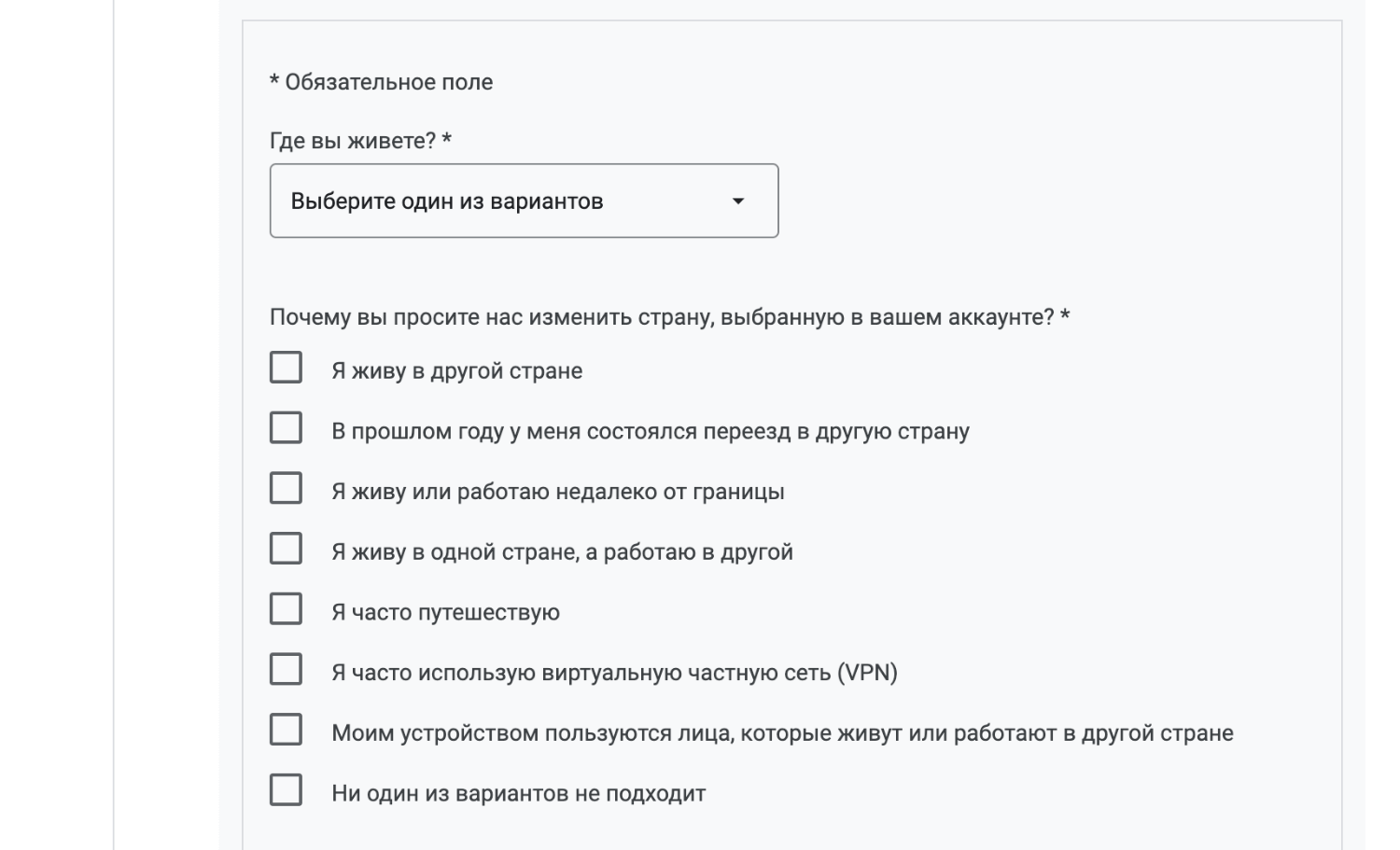 Просто выберите страну или регион в выпадающем меню «Где вы живете?», а затем укажите одну или несколько причин изменения, например: «Я часто путешествую», «Я часто использую виртуальную частную сеть (VPN)», «Я живу в одной стране, а работаю в другой» или «Ни один из вариантов не подходит».
