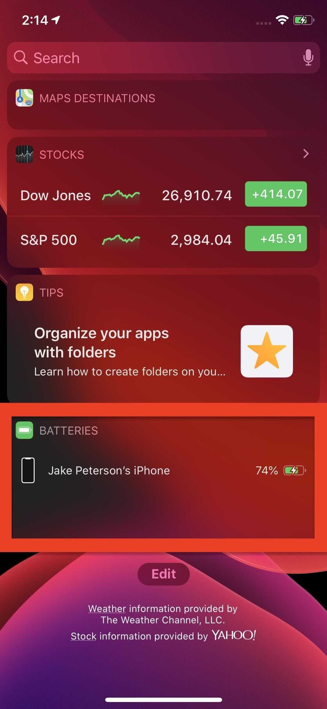 После добавления виджета «Батареи» вы сразу увидите процент заряда батареи вашего iPhone. В качестве бонуса вы увидите процент заряда батареи любых подключенных устройств, таких как AirPods или Apple Watch.
