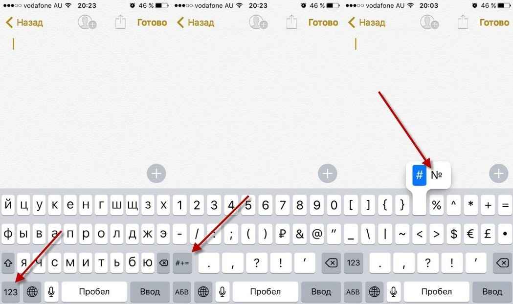 - Найти символ «#», нажать на него и не отпускать. В момент, когда над ним появится «№», нужно проскользнуть пальцем по нему и отпустить.