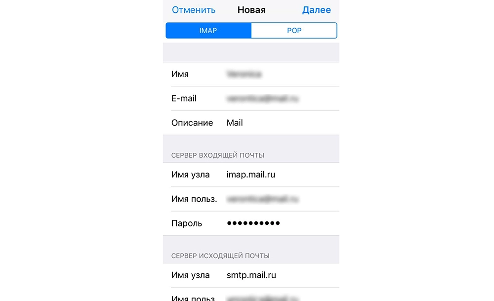 - Заполнить сведения в полях серверов входящей и исходящей почты, затем тапнуть на «Далее».