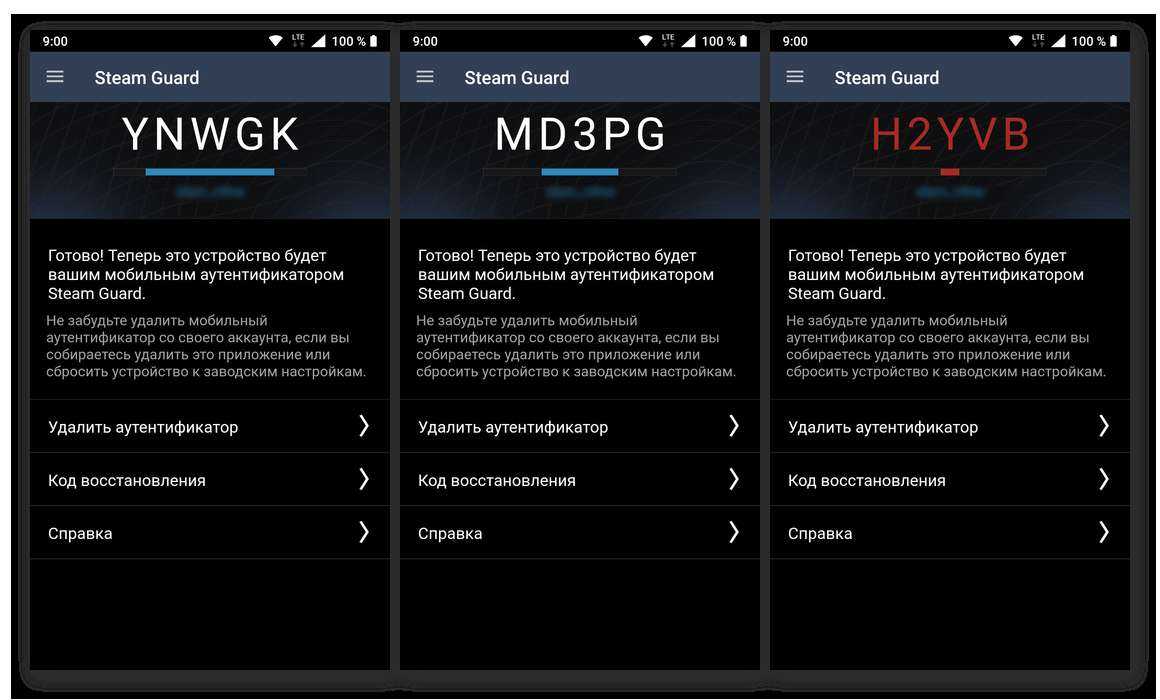 На этом все, номер мобильного телефона привязан к Steam, а аутентификатор Steam Guard удачно подключен. Сейчас ваш акк находится под более надежной защитой. Ниже показано то, как происходит процесс генерации кодовых композиций (три различных примера). Под ними размещена полоса индикации, которая обозначает время деяния. Когда время завершается, код багровеет и заменяется на новый.