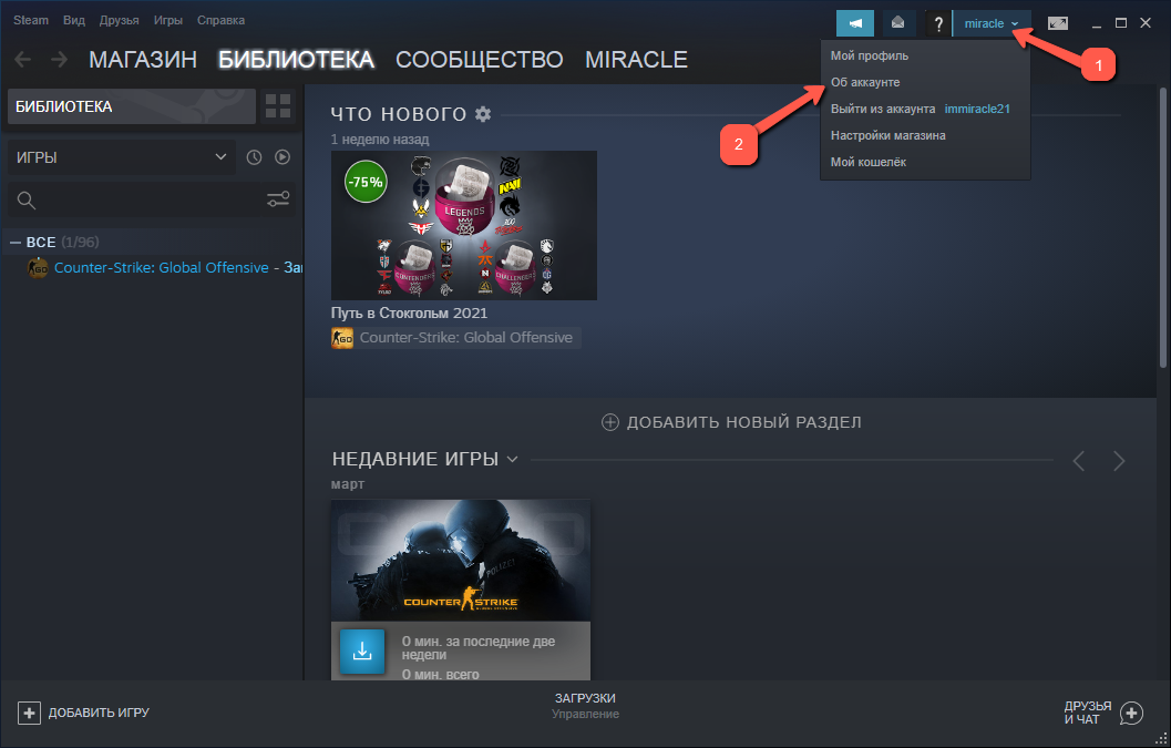 Для её подключения необходимо войти в Стим, авторизоваться в нём. Затем нажать на имя пользователя вверху справа и в появившемся меню выбрать строку «Об аккаунте».