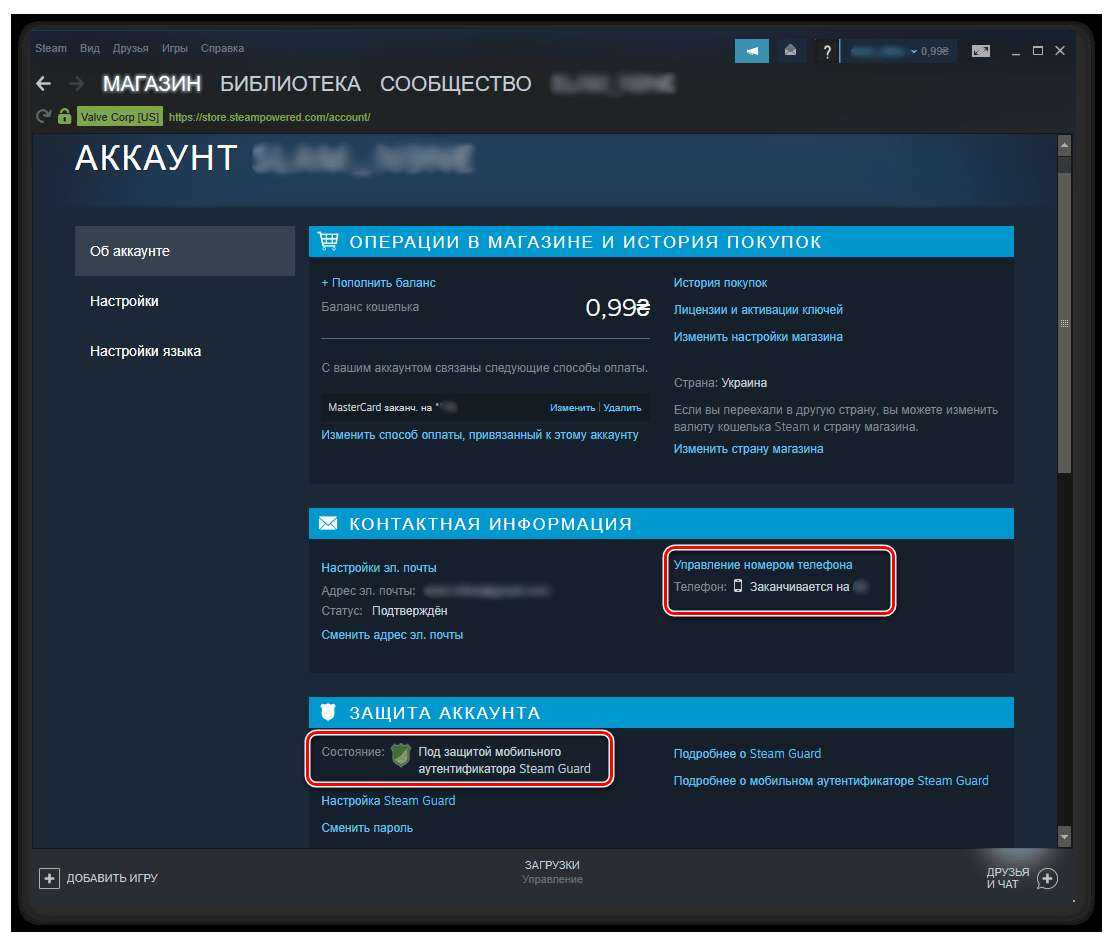 Если данные будут введены правильно, вы удачно войдете в свою учетную запись Steam. Для того чтоб убедиться в том, что мобильный телефон привязан к основному аккаунту, довольно перейти в раздел «Об аккаунте» в программке на компьютере. На открывшейся страничке в блоке «Защита аккаунта» должна быть надпись «Под защитой мобильного аутентификатора Steam Guard», а выше — ваш номер телефона, который будет фактически на сто процентов укрыт для обеспечения безопасности.