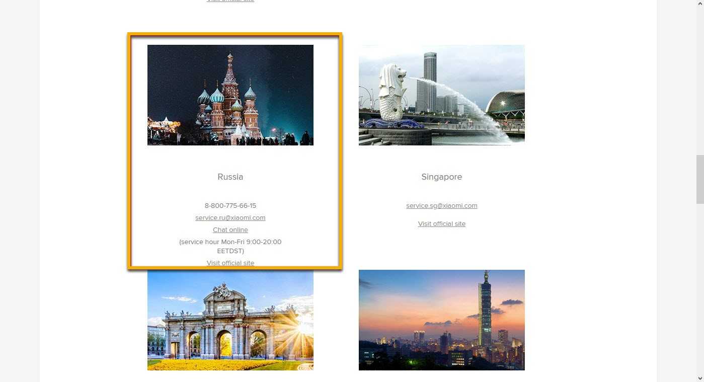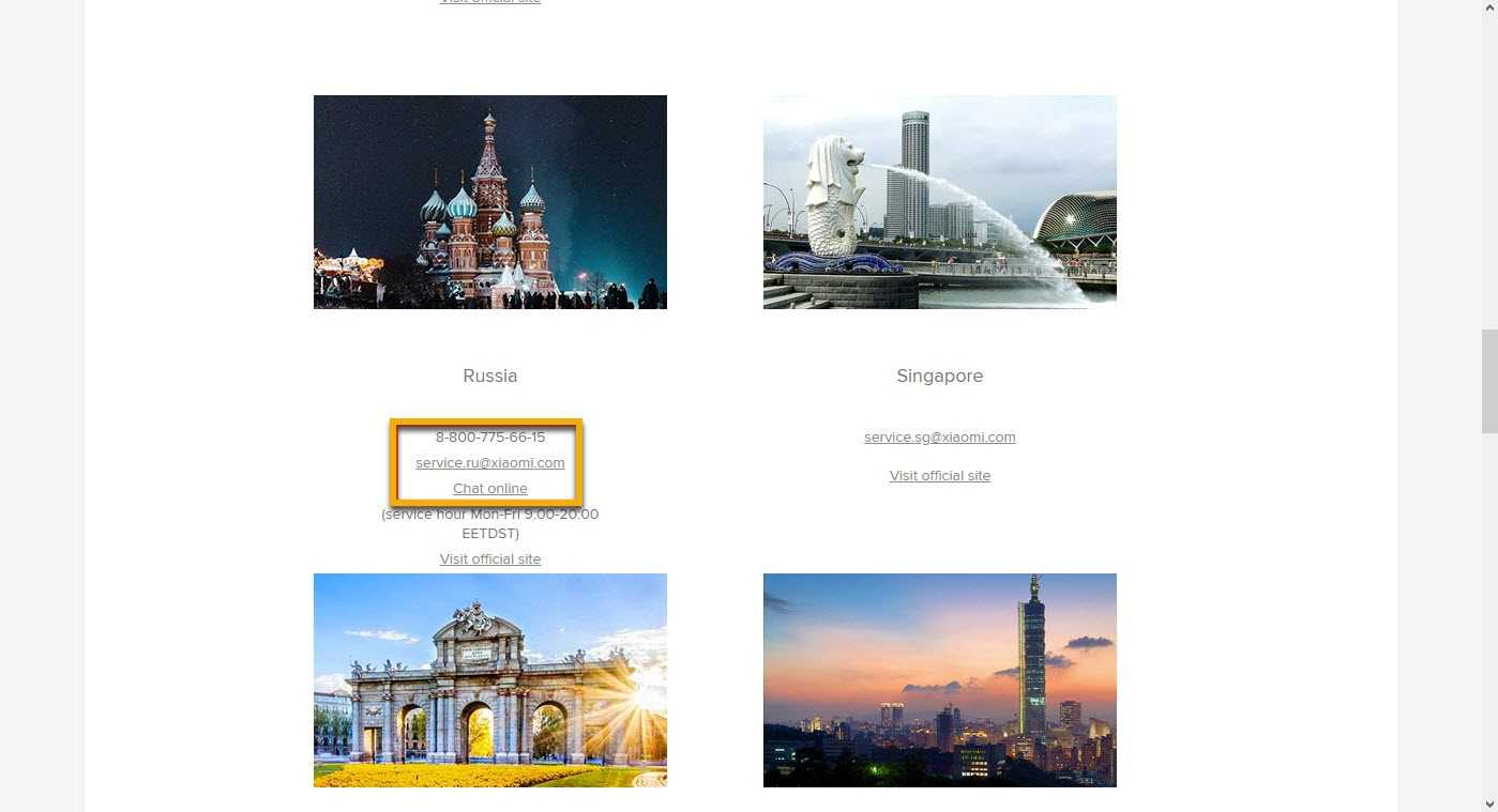 Вот контактные данные службы поддержки Xiaomi для разных стран: