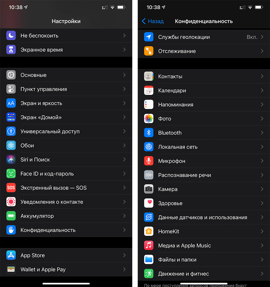 Большинство типов разрешений объединены в категорию «Конфиденциальность». Сюда входят службы определения местоположения (GPS), контакты, календари, напоминания, Bluetooth, микрофон, камера, здоровье, HomeKit и движения. Приложения также могут запрашивать доступ к вашим учетным записям Facebook и Twitter, и это разрешение также хранится здесь.