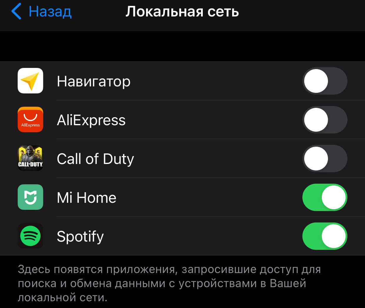 Здесь вы увидите все приложения, которые имеют доступ к устройствам в вашей локальной сети (или пытались его получить). Я, например, оставил доступ только для Spotify (иначе не получится пользоваться Spotify Connect) и Mi Home, поскольку это приложение используется для управления устройствами умного дома. Зачем доступ нужен приложению AliExpress или «Яндекс.Навигатору», так и не понял, поскольку эти приложения никак не связаны с моей локальной сетью и работают без проблем и без лишних доступов.