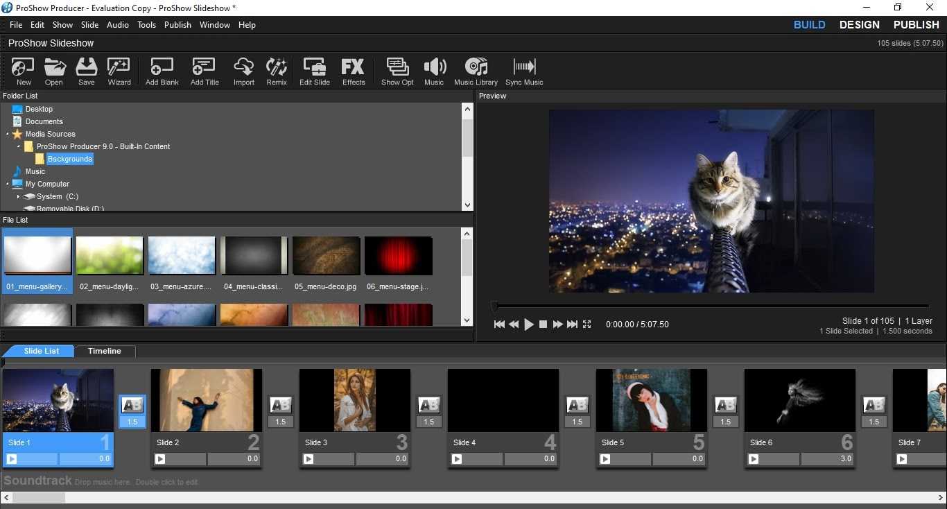 Многофункциональная программа для создания презентаций, позволяющая объединять в одном проекте фотографии, видеофайлы, GIF, звуковые дорожки. Софт позволяет детально изменять каждый добавленный элемент, настраивать сложную анимацию (масштабирование, вращение, изменение угла просмотра и т.д.), добавлять к каждому слайду музыкальный фон, накладывать эффекты вроде снегопада, встраивать анимированные текст и многое другое.