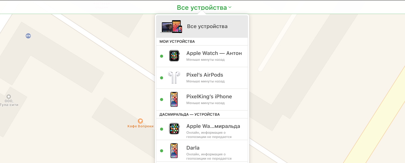 Для доступа к перечисленным функциям потребуется пройти авторизацию, воспользовавшись логином и паролем от Apple ID. После входа над картой местности отобразится иконка для просмотра доступной для редактирования техники Apple.