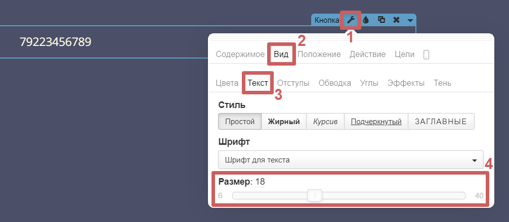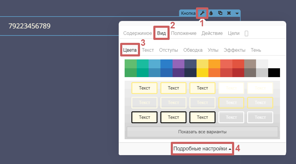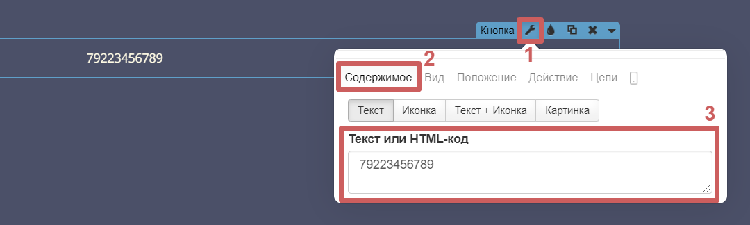 Шаг 2. Перейдём в настройки виджета кнопки (гаечный ключ), в раздел «Содержимое» и укажем наш номер телефона, который будут видеть посетители (можно указать в любом формате).