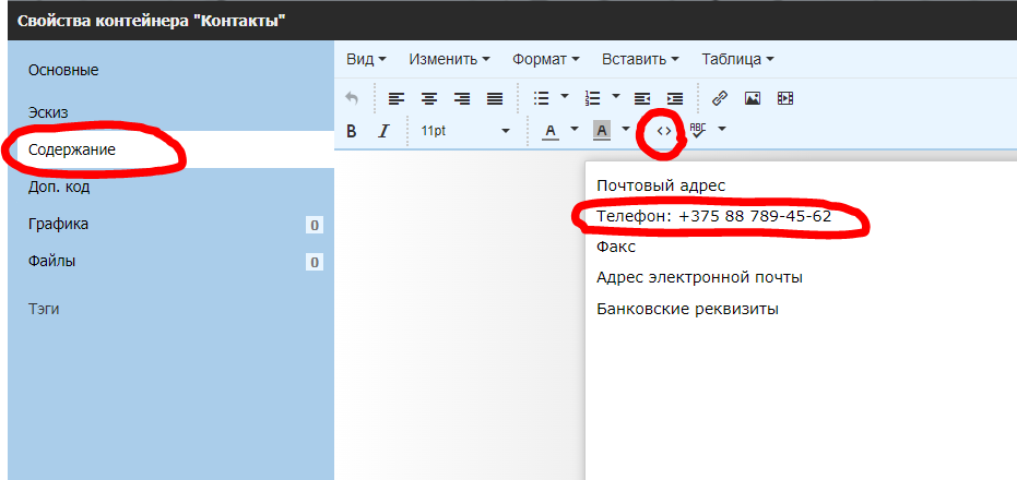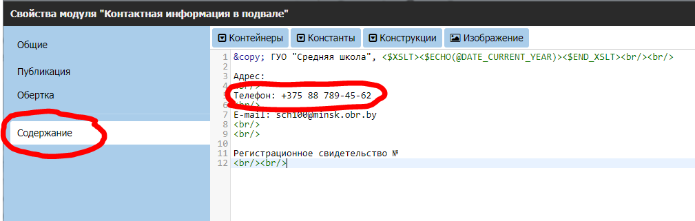 Откройте на редактирование данный контейнер, на вкладке Содержание визуально найдите где расположен номер телефона.