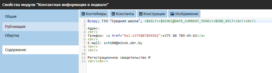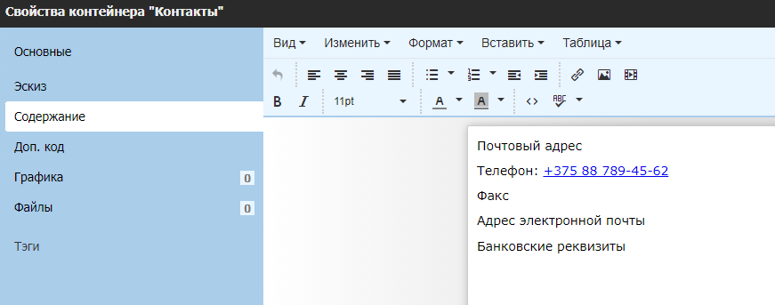 Сохраните внесенные изменения в исходный HTML-код контейнера и убедитесь что номер телефона стал гиперссылкой в визуальном редакторе.