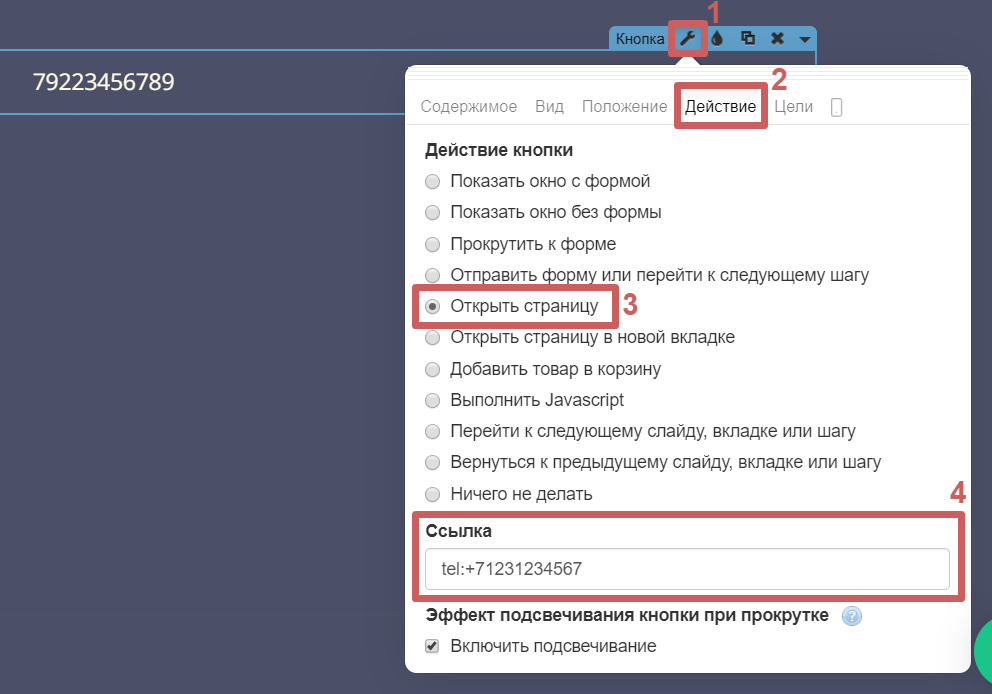 Шаг 4. Переходим в раздел «Действие», выбираем действие «Открыть страницу» и пропишем код телефона в поле «Ссылка».Пример кода: