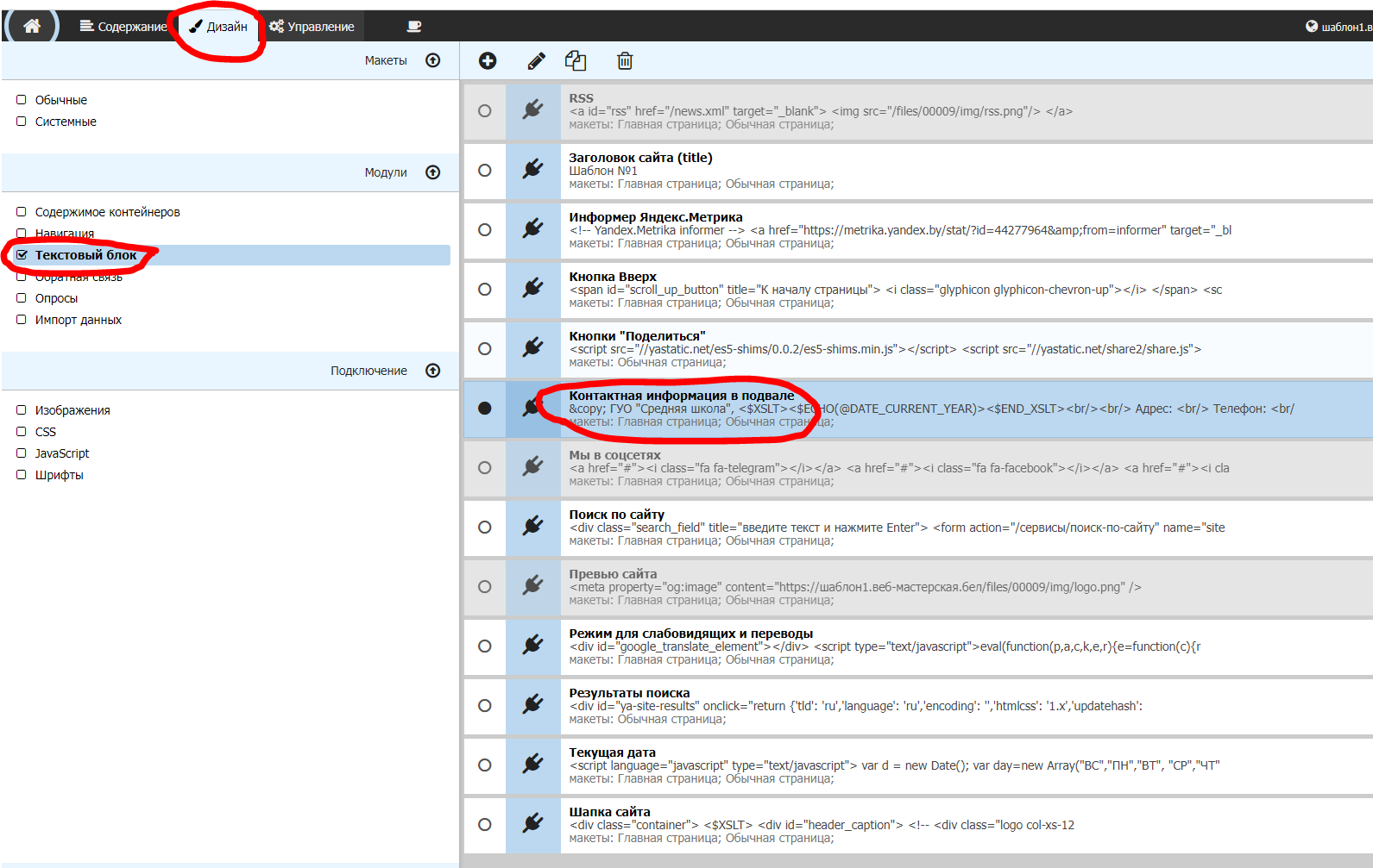 Стандартное размещение содержания подвала сайта в шаблонах сайтов системы Веб-Мастерская находится в разделе Дизайн — Модули — Текстовый блок — Контактная информация в подвале