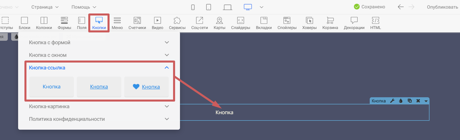 Введенные изменения нужно сохранить в этом блоке, а после можно публиковать страницу.