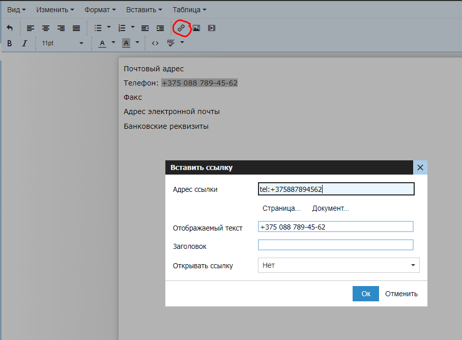 Выделяем телефон и кликаем на значке ссылки. Дальше выполняем уже знакомые нам действия: