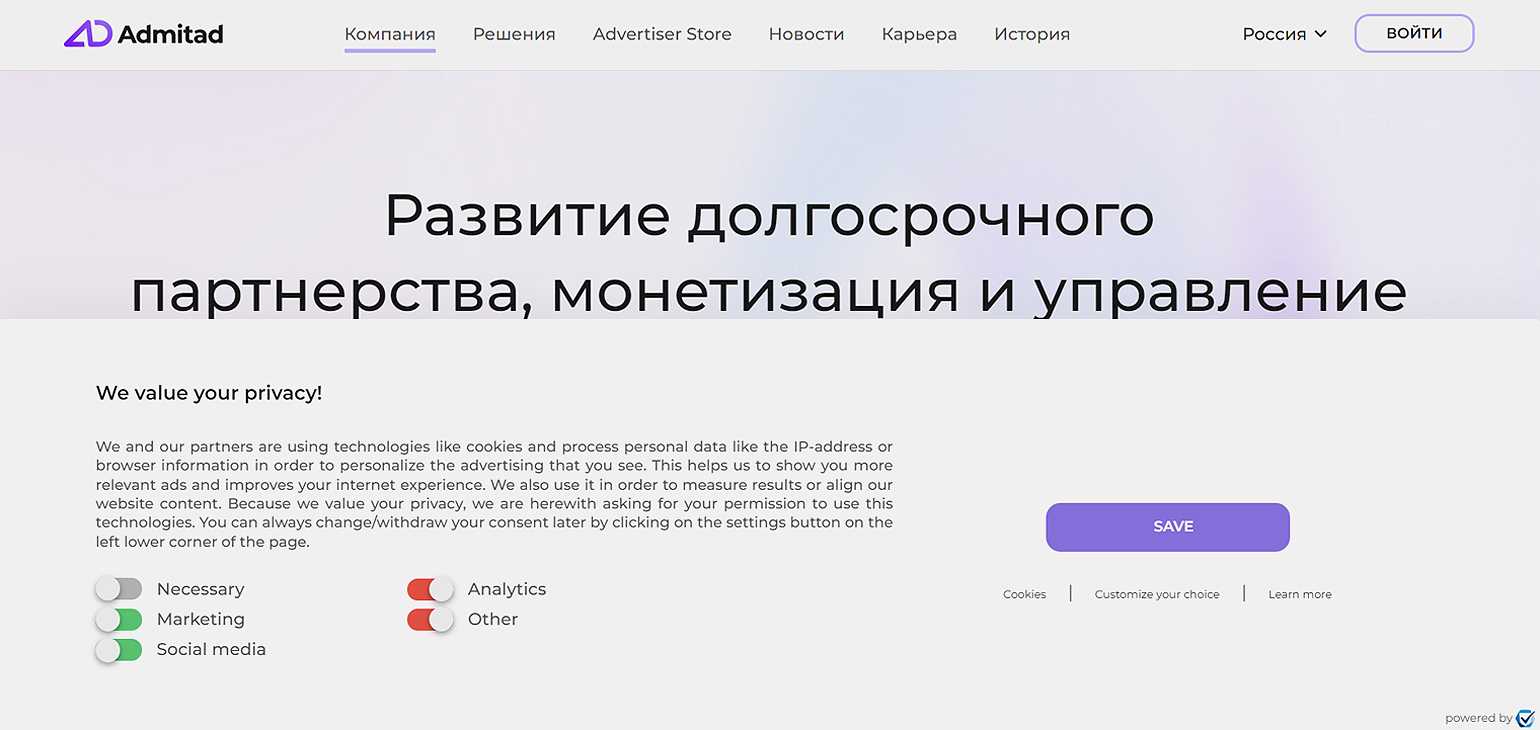 На сайте admitad.ru при предложении сохранить куки возникает путаница: ползунок находится слева, что чаще всего означает положение «выключено», а цвет ползунка — зелёный, что соответствует положению «включено».Скриншот: admitad.com