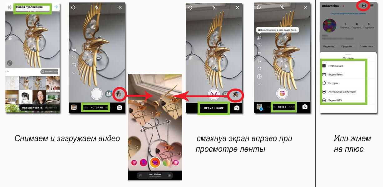 Просматривая ленту, смахнем экран вправо: откроется окно съемки видео. Снять ролик и сразу выложить можно в Истории, Reels, а также в раздел IGTV, записав Прямой эфир. Заранее отснятое видео можно добавить везде, кроме Прямого эфира, соответственно.