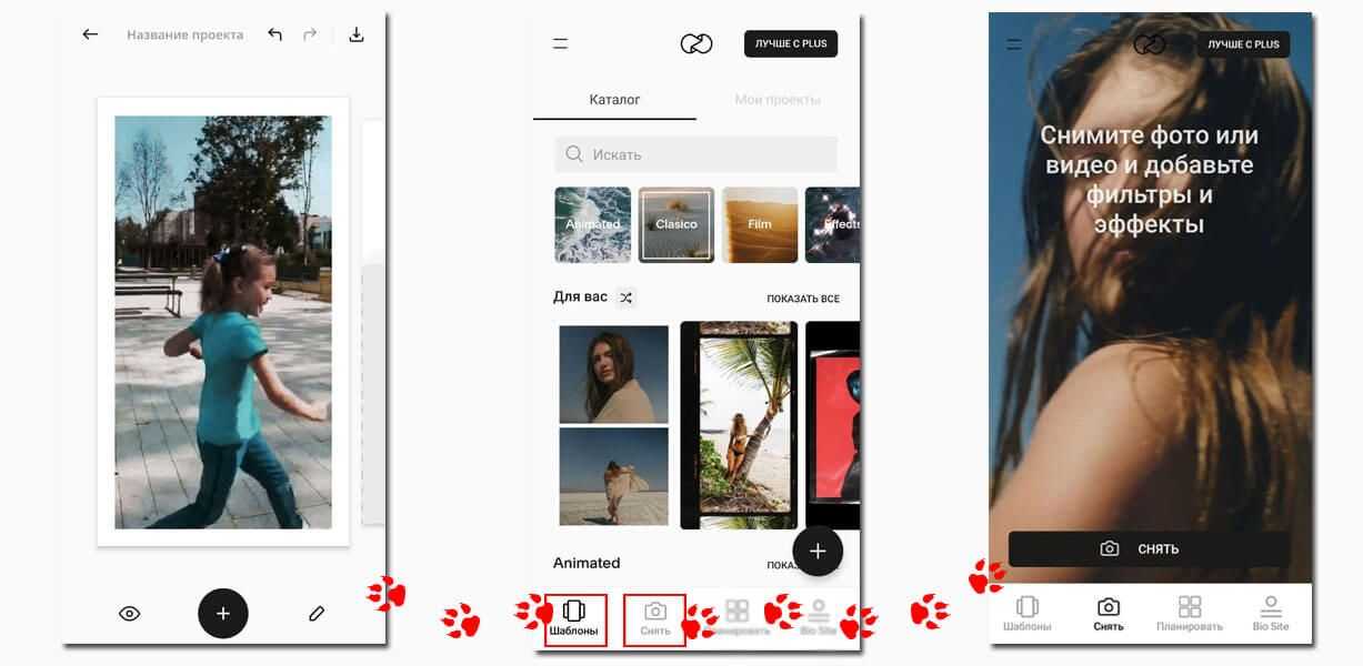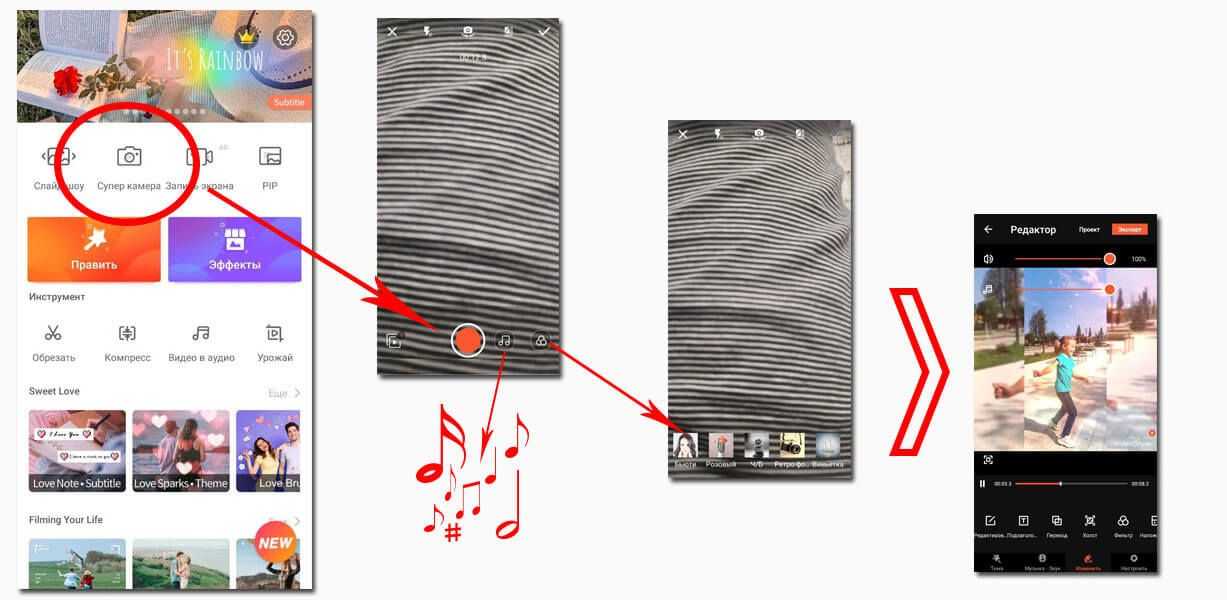 Что касается съемки, то можно записывать видео инструментом, находящимся в программе. Помимо непосредственно записи можно наложить фильтр и добавить музыку, а потом снимать под эту музыку креативные видео для Инстаграма*!