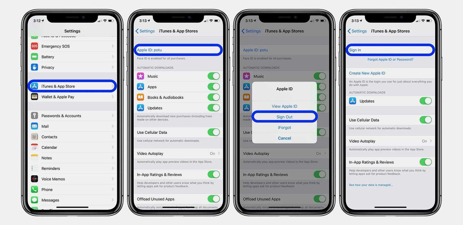 - Если вы используете iOS 10.3 или более поздней версии, выберите «Настройки» и нажмите «Вход в ». Введите идентификатор Apple ID, который вы хотите использовать для iCloud. Вернитесь на экран «Настройки», прокрутите вниз и нажмите «iTunes Store и App Store». Нажмите «Apple ID: » > «Выйти». Затем выполните вход с помощью идентификатора Apple ID, который вы хотите использовать для iTunes.