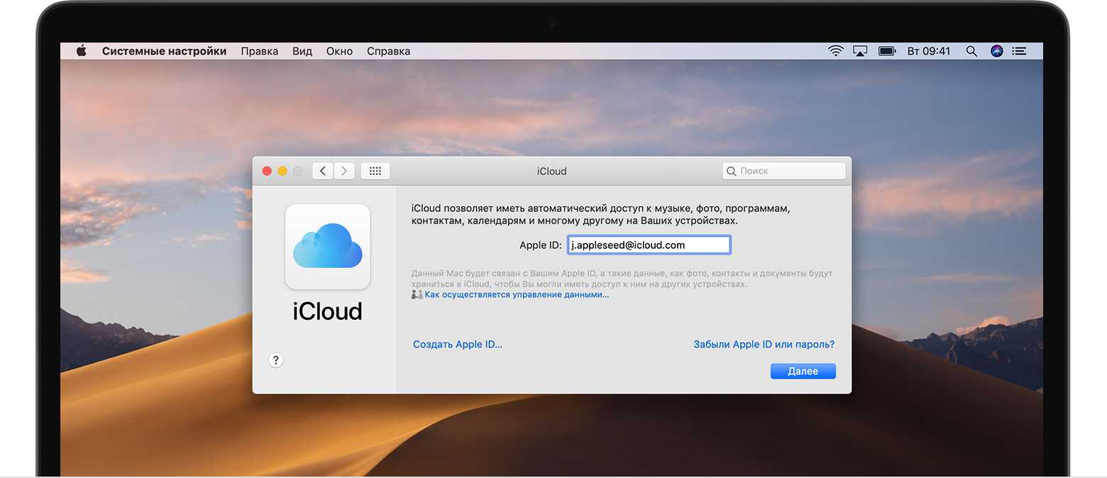 iCloud Перейдите в меню «Системные настройки» > iCloud. Введите свой идентификатор Apple ID и пароль. Нажмите кнопку «Войти».
