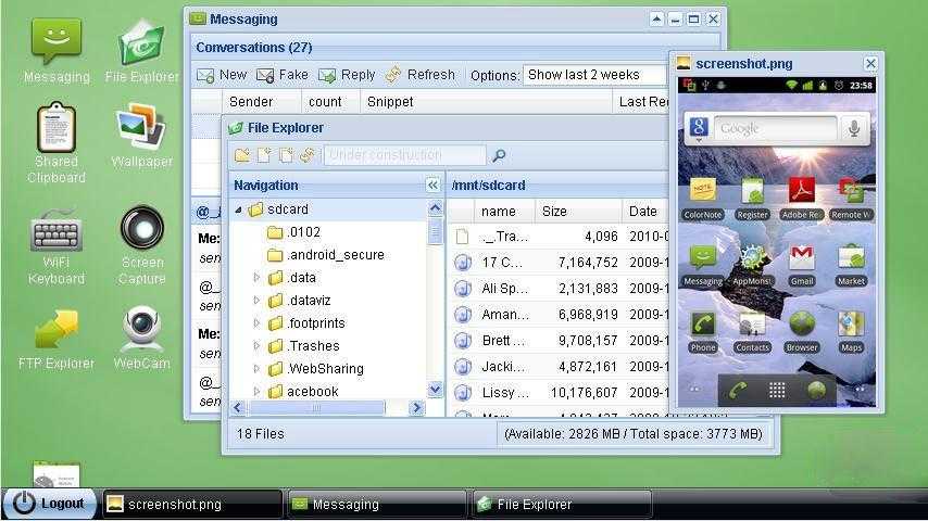 Интересное решение для консерваторов и пользователей, которые боятся запутаться в интерфейсе. Вы просто получаете экран своего Андроида на рабочем столе компьютера. Можно производить те же действия, что доступны в мобильном устройстве, за счёт создания VNC сервера. Программа из разряда «must have» для копирования контактов или СМС. Работа с персональной информацией требует аутентификации.