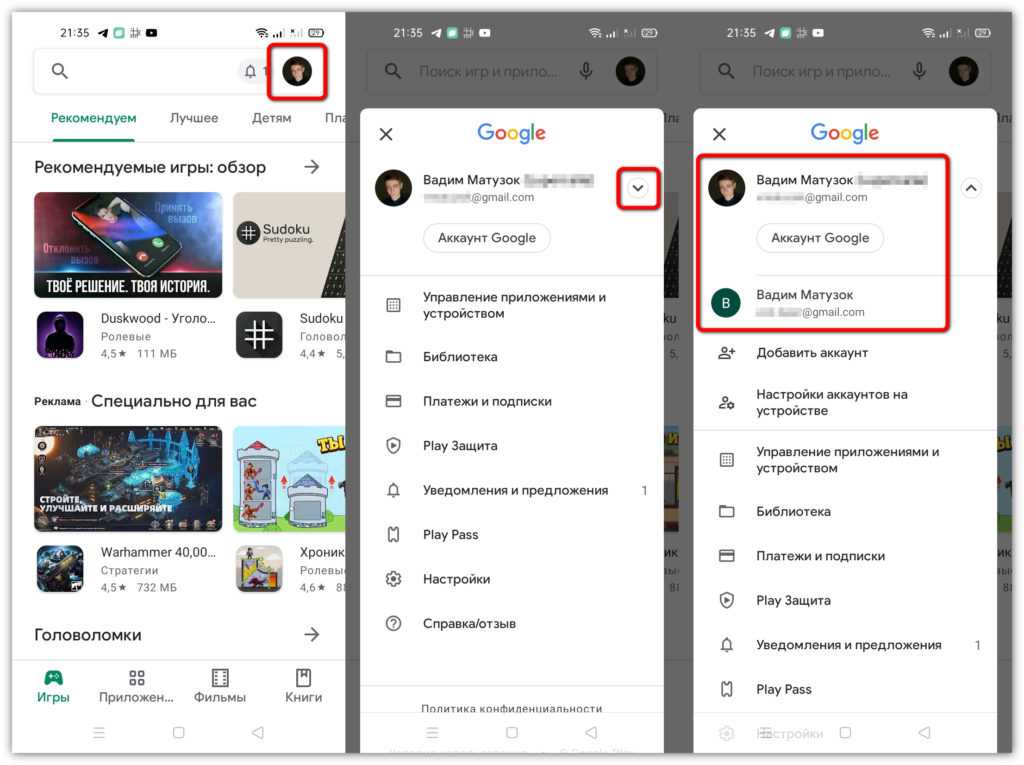В остальном никаких отличий в смене Google-аккаунта нет, за исключением особенностей оболочки и версии операционной системы. Это влияет только на расположение разделов и кнопок в меню.