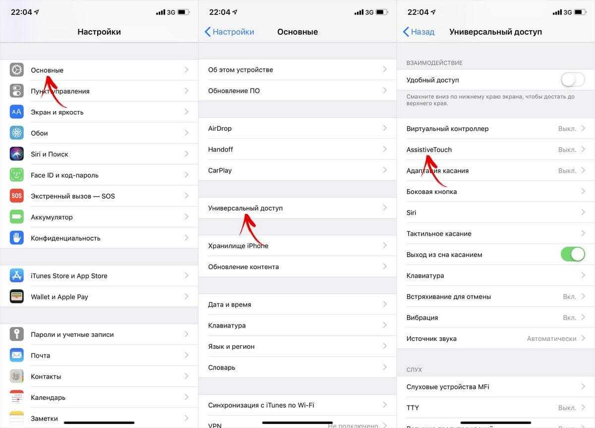 В меню «настройки» выбирается «основные», щелкается раздел «универсальный доступ» и выбирается «AssistiveTouch»;