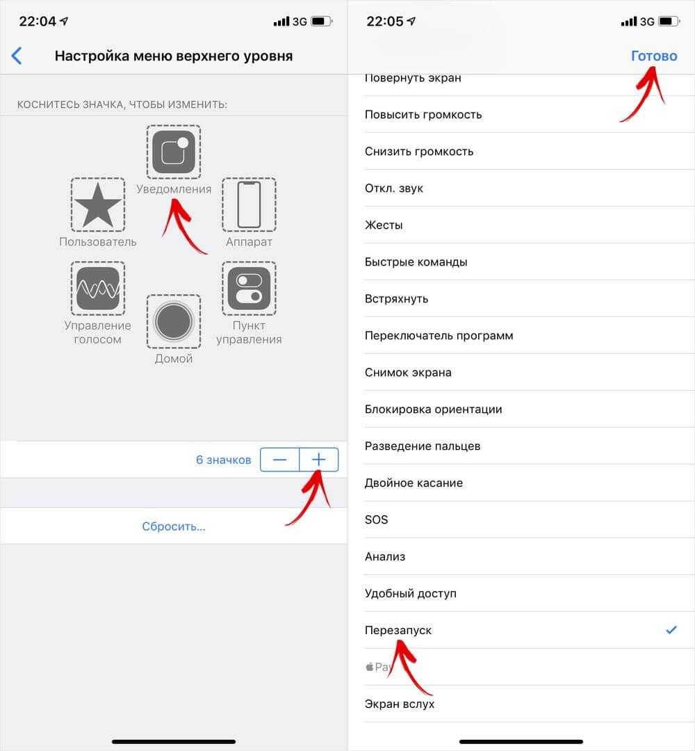 - функция перезапуска не входит в опции, используемых AssistiveTouch, соответственно, ее необходимо добавить;